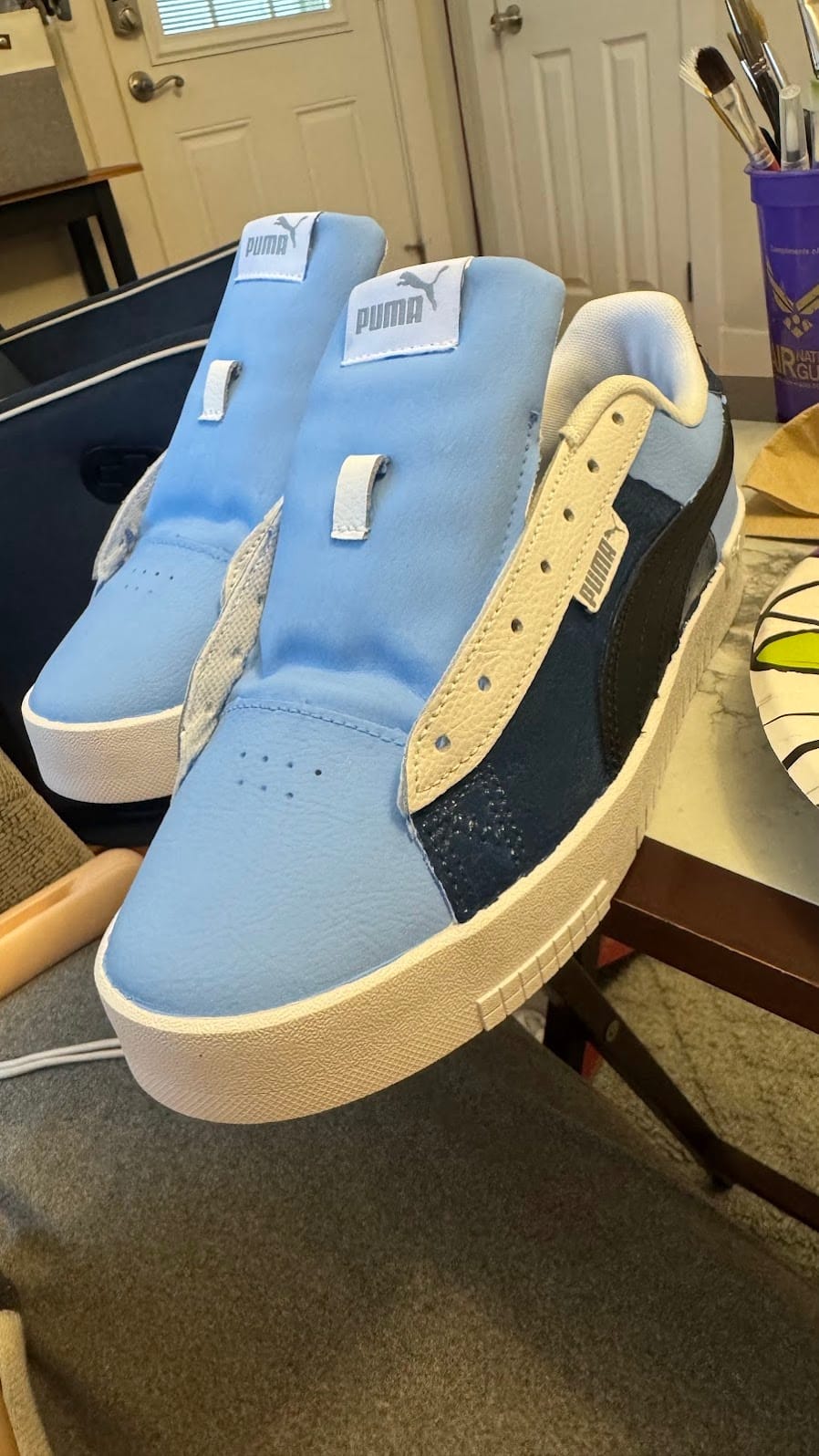 So my shoes were looking fine and I was so excited to wear them for the event. I was concerned that the paint might scratch off, so I was careful to wrap them in a t-shirt in my luggage. The morning of, I put them on and went to the grocery store. I quickly realized when we returned that the shoes were not going to hold up. The paint was scratching at every crease and the paint on the sides of the soles was peeling. After that point, I was enjoying documenting their slow demise and leaving blue paint confetti everywhere I went.