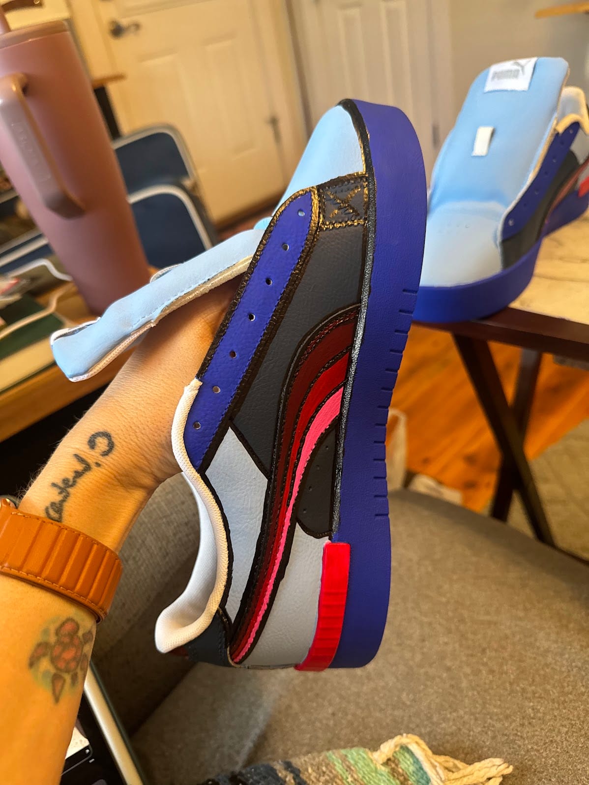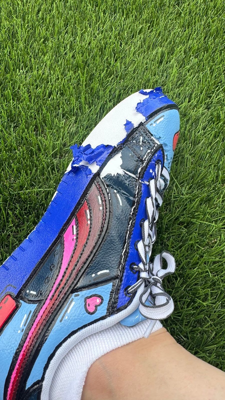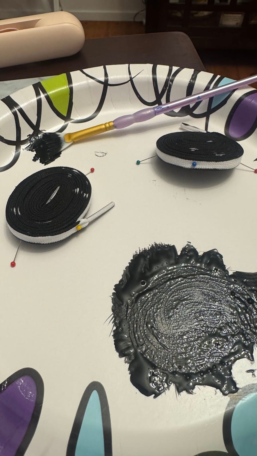 I took pictures of the shoes and uploaded them to procreate to plan out a design and then got to painting. The matte paint went on really easily and had good coverage. The satin paints had so little coverage that it took four coats to look decent. Once the base colors were on, I tried to use an acrylic paint pen for the outlines, but it didn't really work, so I switched to black paint and a brush. I used the paint markers for the designs and love how they turned out. The sealer was simple enough to use and I think I put three thin coats on. I also remembered a technique I had seen for painting the sides of the laces. You roll them up, secure with pins, and dip them in paint. That worked perfectly!